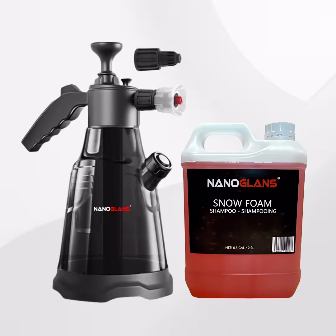 Möchten Sie Ihr Auto streifenfrei sauber ohne zu kratzen? Die Nanoglans Handschäumer in Kombination mit dem Schnee-Schaum 2.5L ist das perfekte Vorwaschmittel, um hartnäckigen Schmutz vor der Handwäsche einzuweichen.